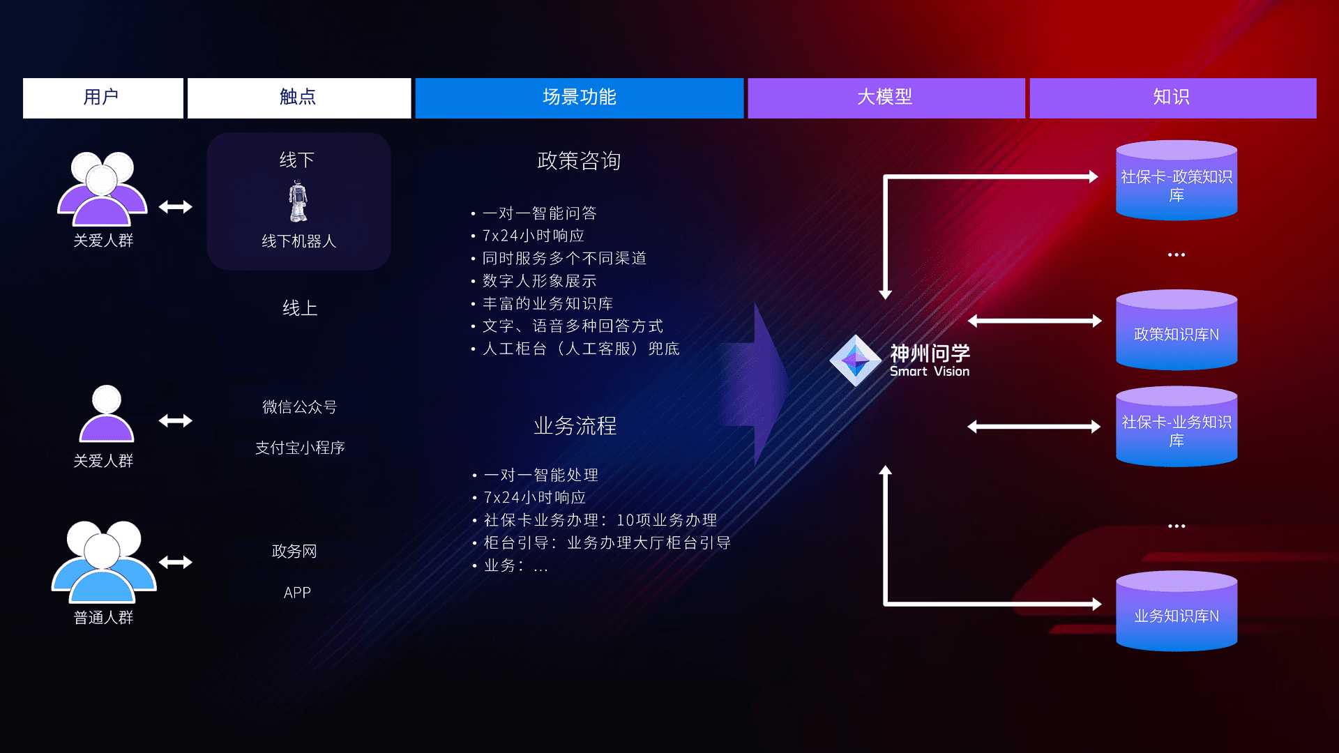 • 利用大语言模型+RAG技术,,,,支持多轮对话,,,,可识别多种同义词、、、近义词,,,,精准理解关爱人群语义快速输出结果。。。。