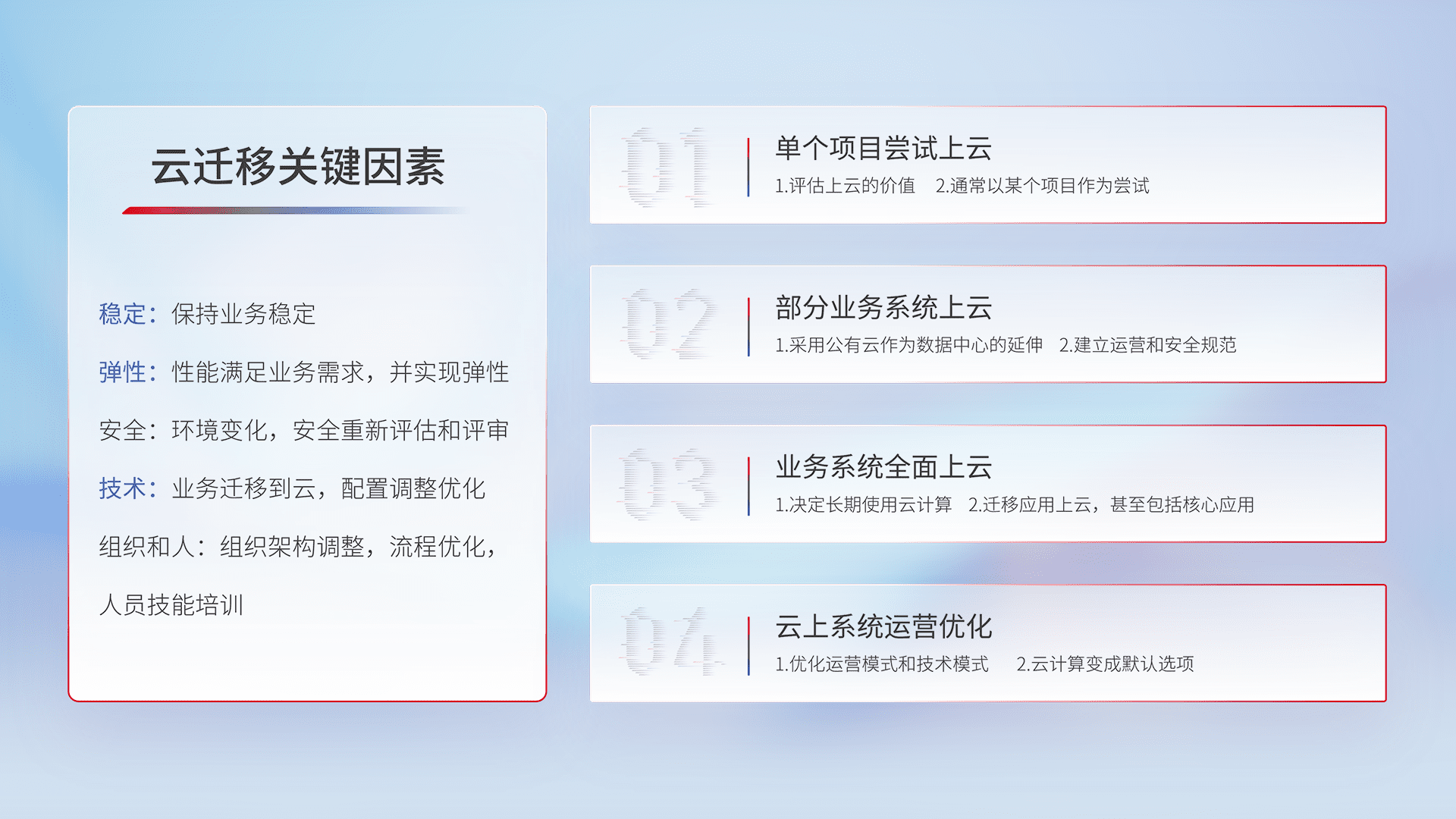 结合实际业务,,从规划设计、、云平台选型、、、、云原生改造、、、数据迁移、、、、集成交付,,迁移全过程为客户识别最佳上云路径,,,做好风险识别管理,,,,设计网络架构、、、身份权限、、安全审计合规、、、操作审计、、、日志审计、、监控告警策略、、多站点容灾设计等,,,,对云上基础设施进行整体规划,,提升IT治理水平,,以满足弹性、、高可用、、、、高性能的需求。。。。