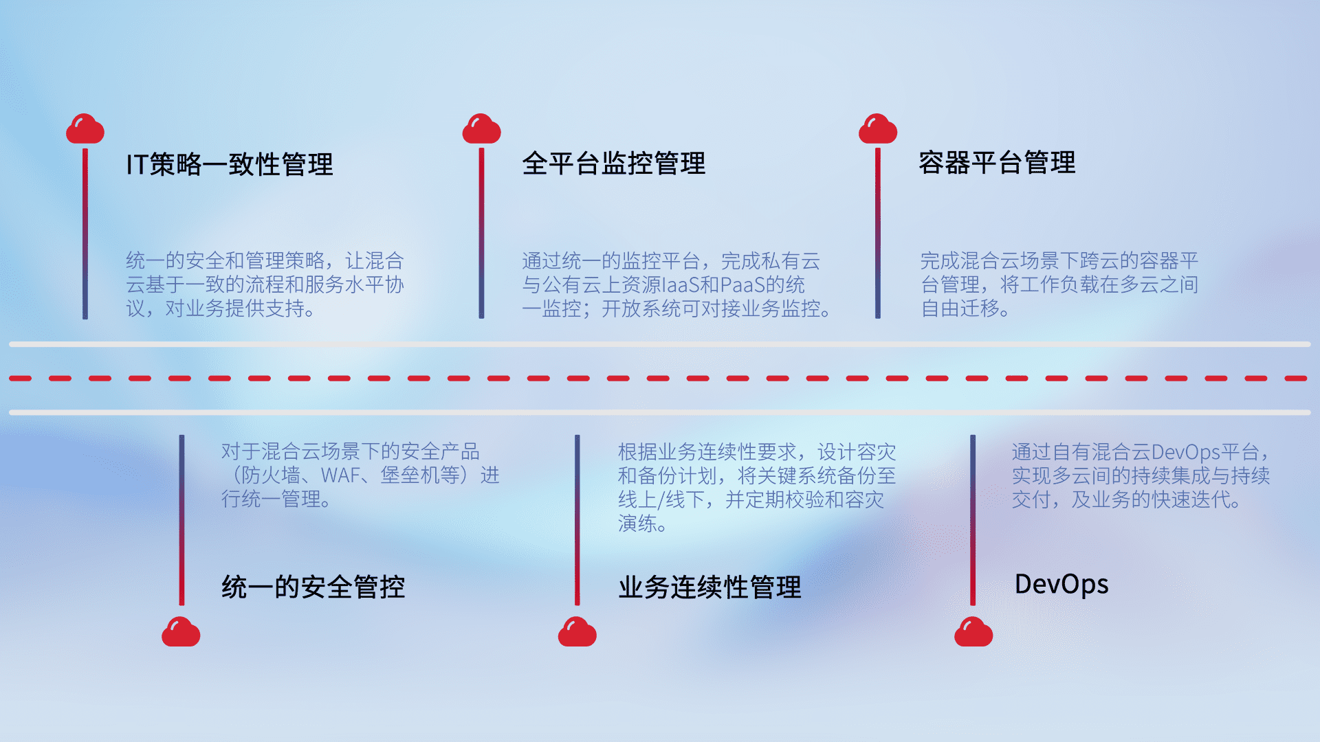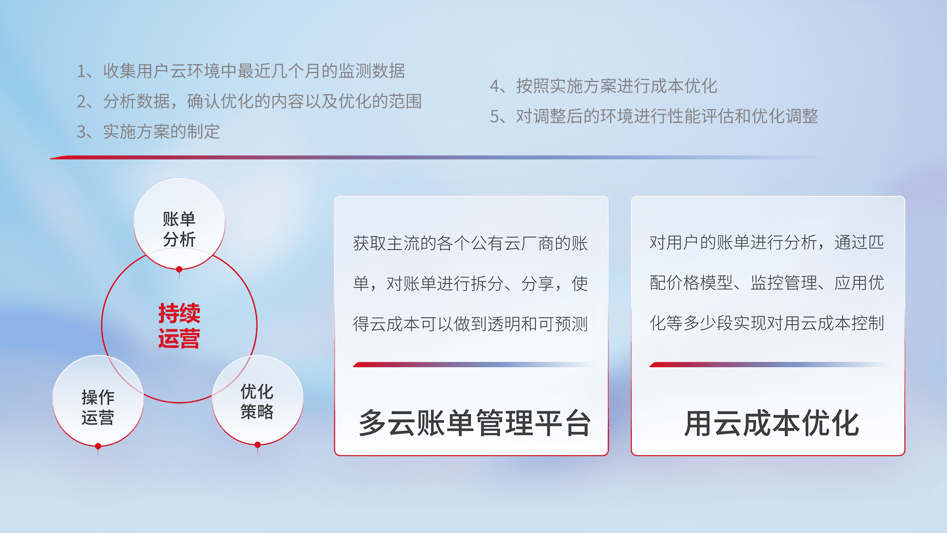 通过多云纳管,,,以统一的资源数据模型把客户的云资源进行抽象和封装,,,,进而实现对多云资源的统一操作,,,保障云资源管理的可靠性、、稳定性与可用性。。。。量身定制化运维内容,,配置、、、、开发运维、、、、补丁管理、、备份、、、监控、、、认证和访问管理、、、审计和日常巡检等,,保障在用云过程中的可靠度,,,,稳定度以及高可用率。。